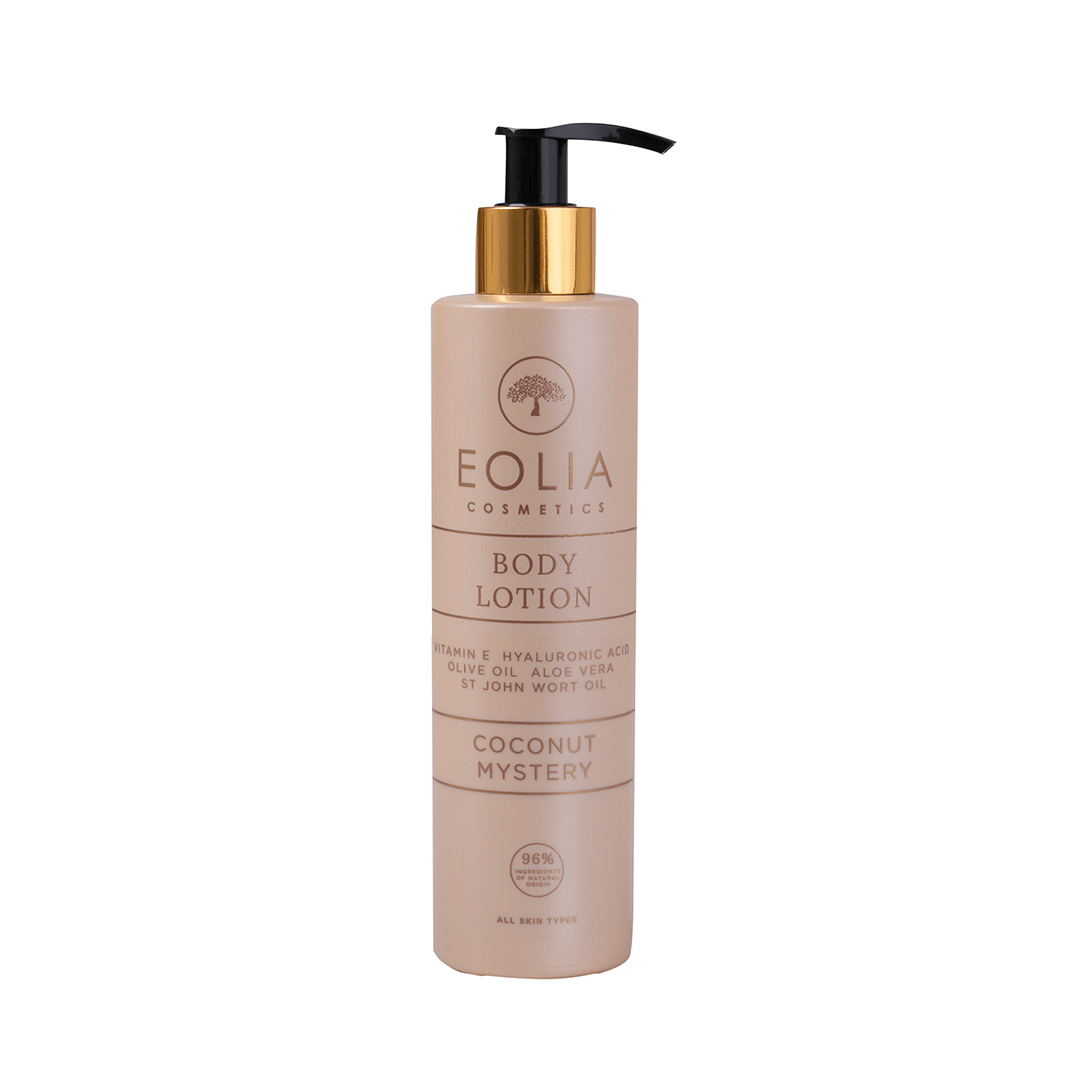 Eolia body lotion with hyaluronic acid, cold pressed olive oil, balsam oil, aloe and vitamin E.Its rich composition prevents the loss of moisture while moisturizingwith the tropical and mysterious aroma of coconut that seduces like a Greek sunny summer.